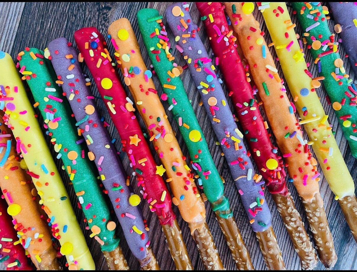 Crispy pretzels coated in a rich layer of chocolate, finished with delightful toppings like sprinkles, nuts, or an extra drizzle.