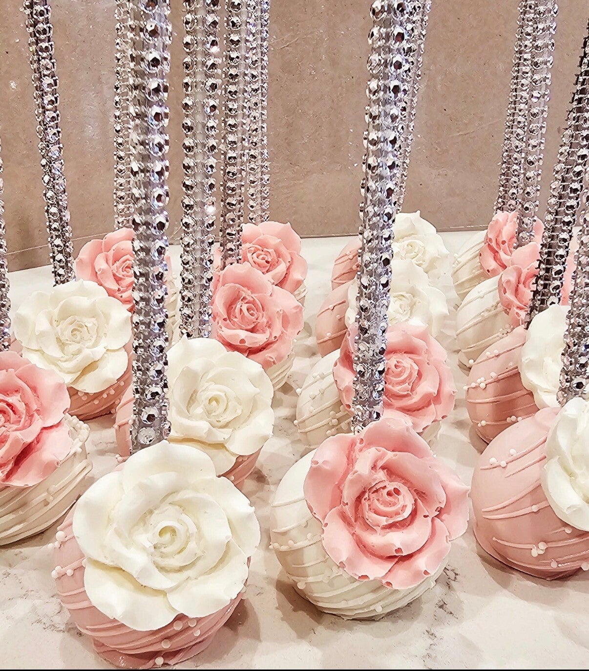 Moist cake bites on a stick, dipped in luscious chocolate and customized with colors and designs to match your celebration.